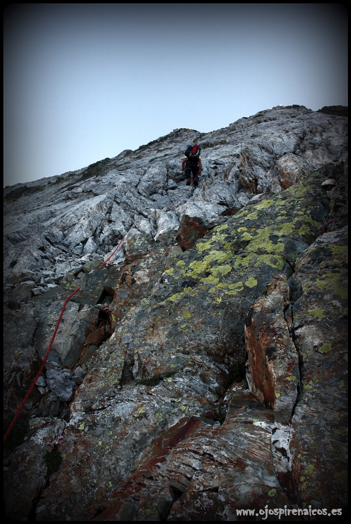 Unos mensajes empujan las ganas de seguir Pirineando agusto, disfrutando del nada que hacer, dejando unos cientos de metros más abajo la calor y aprovechando reencuentros e ilusiones. Hay grandes paredes en este Pirineo, enormes lugares en los que la sombra reaparece escasos minutos al día, los colores dibujan líneas atractivas que vemos desde la lejanía, que soñamos con palpar de cerca, con recorrer, con descubrir… Tengo un plan, y tengo un compañero elegante con Txabi, que como yo, es un apasionado del paisaje, de territorio y de los que ates no tenían miedo a encaramarse a estas paredes abruptas pero acogedoras. Nos levantamos sin prisa, nadie nos espera a cenar, y a media tarde ya nos avisan en Bachimala de que allí arriba «estaríamos solos». Perfecto, nuestras intenciones eran esas mismas. Buen trato en el refugio, buen consejo y bien grande la jarra de cerveza que nos da aliento para seguir hacia los Ibones azules…que siguen bien rodeados de nieve en este verano entrado en años. Cambiamos el disfraz de senderista por el de alpinista y sacamos una cuerda que unirá nuestros pasos crujientes en el glaciar de los Infiernos, tras el cual vamos parando intermitentemente mirando a lo más alto, donde los rayos de sol despuntan y alumbran lo que esperamos sea nuestro techo de estrellas… Hay varios recorridos posibles, chimeneas, canalones, repisas, fisuras, viras, espolones, ofita, mármol….un puñado de sensaciones incontables que se pasean antes los ojos para olvidar la realidad de los mil metros. Vamos pasando pruebas, avanzando sin pausa para disfrutar del calor y agarre a agarre llegamos a la arista cimera, decantándonos por su cumbre Norte, que pacientemente nos espera con un pequeño vivac reconfortable y mágico…